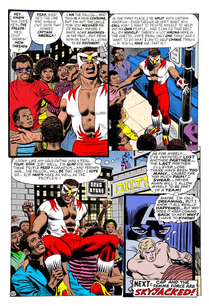 This dream includes thought balloons for Sam and Cap, plus a long discussion between them and Sam unveiling his new Falcon costume. Then Sam goes off to bust up the pusher-man and be hailed as a hero by everyday folk, the page you've got, and Cap wakes up.